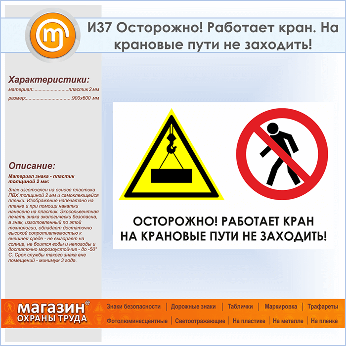 Знак «Осторожно! Работает кран. На крановые пути не заходить!», И37 (пластик, 900х600 мм) в Арзамасе купить